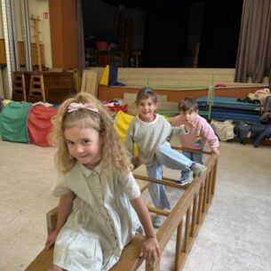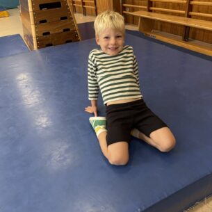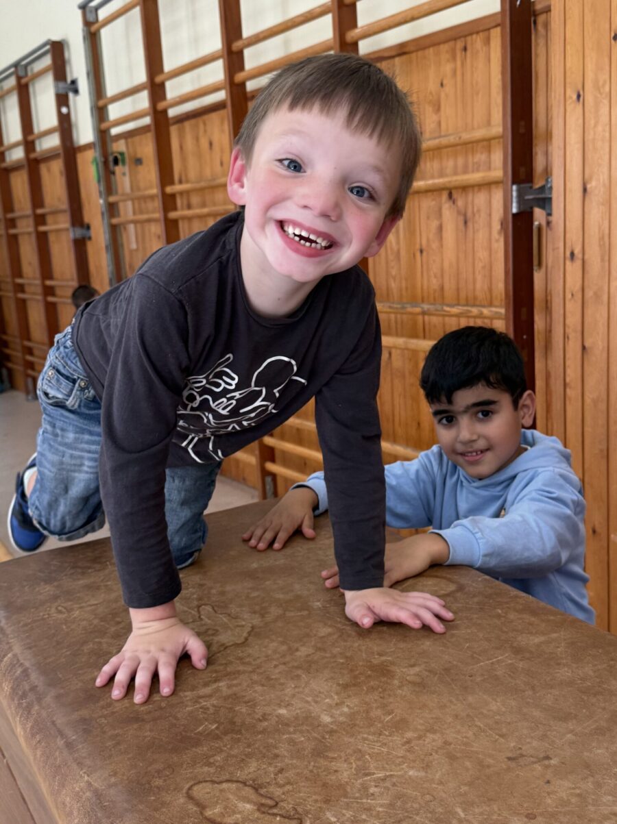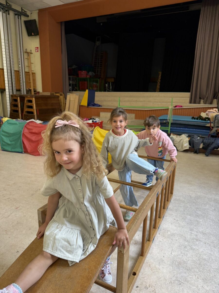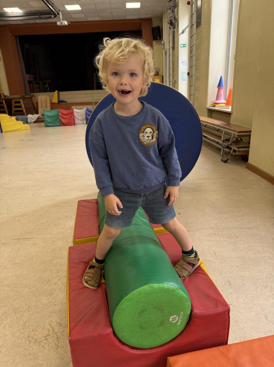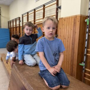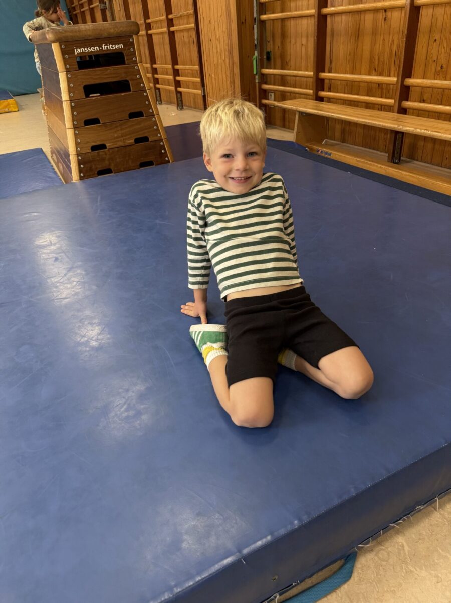 We rekken en strekken de beentjes. In de turnzaal oefenen we alvast om goed te klimmen, kruipen, rollen, springen, evenwicht bewaren… De kinderen hebben het alweer helemaal naar hun zin. Ze genieten enorm van het turnen op maandag en dinsdag.