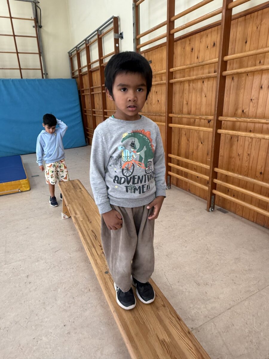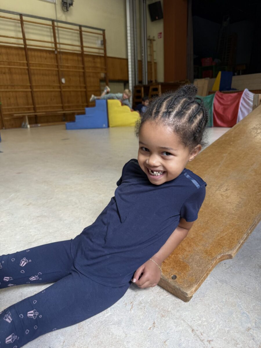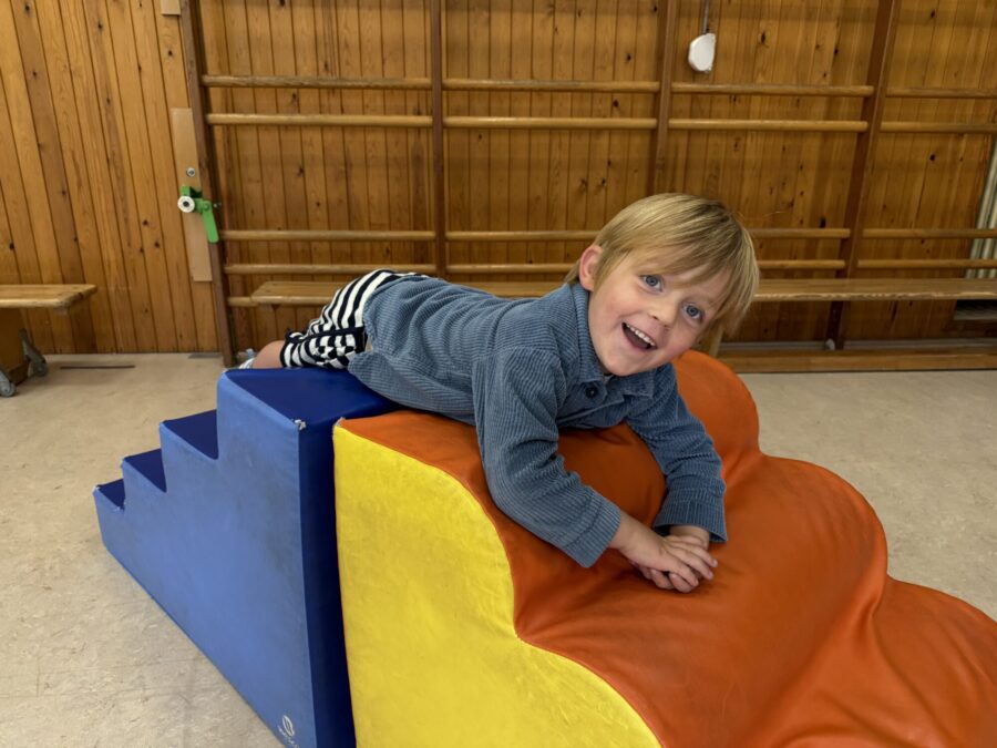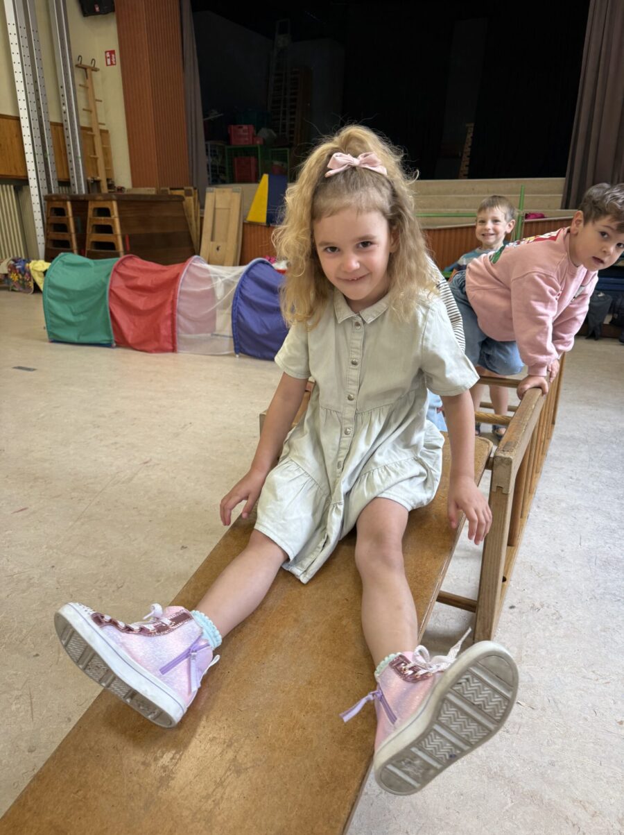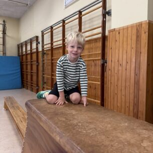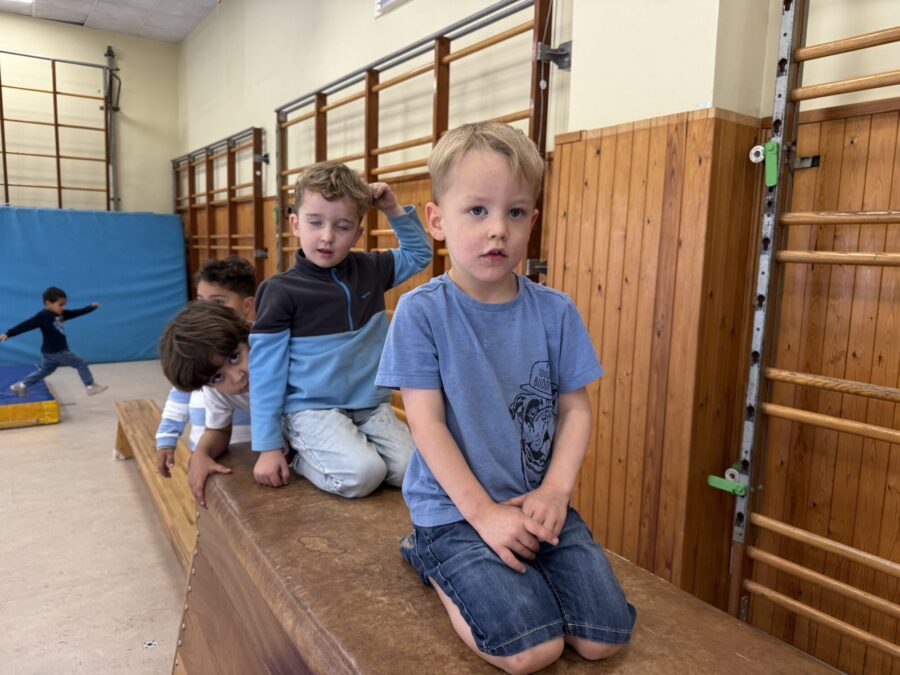 We rekken en strekken de beentjes. In de turnzaal oefenen we alvast om goed te klimmen, kruipen, rollen, springen, evenwicht bewaren… De kinderen hebben het alweer helemaal naar hun zin. Ze genieten enorm van het turnen op maandag en dinsdag.